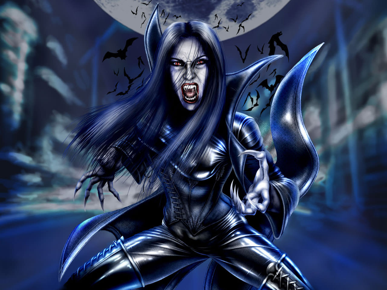 Вампиресса с устрашающим видом, девушка-вампир, вампирша с летучими мышами.