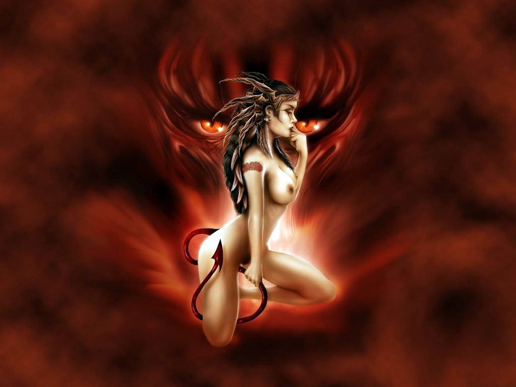 Приспешница, дьявола, голая, демонесса, обнаженная, сексуальная, девушка, демон, с, хвостом, под, надзором, дьявола, пламя, красные, глаза