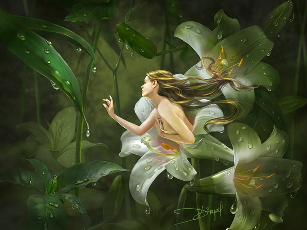Девушка в цветке, обнаженная девушка в цветах-колокольчиках, растения, листья, капли, зелень.