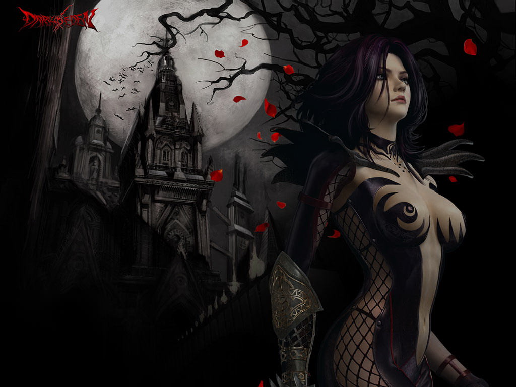 Темный замок, летучие мыши, луна, девушка, лепестки, ночь, тьма.