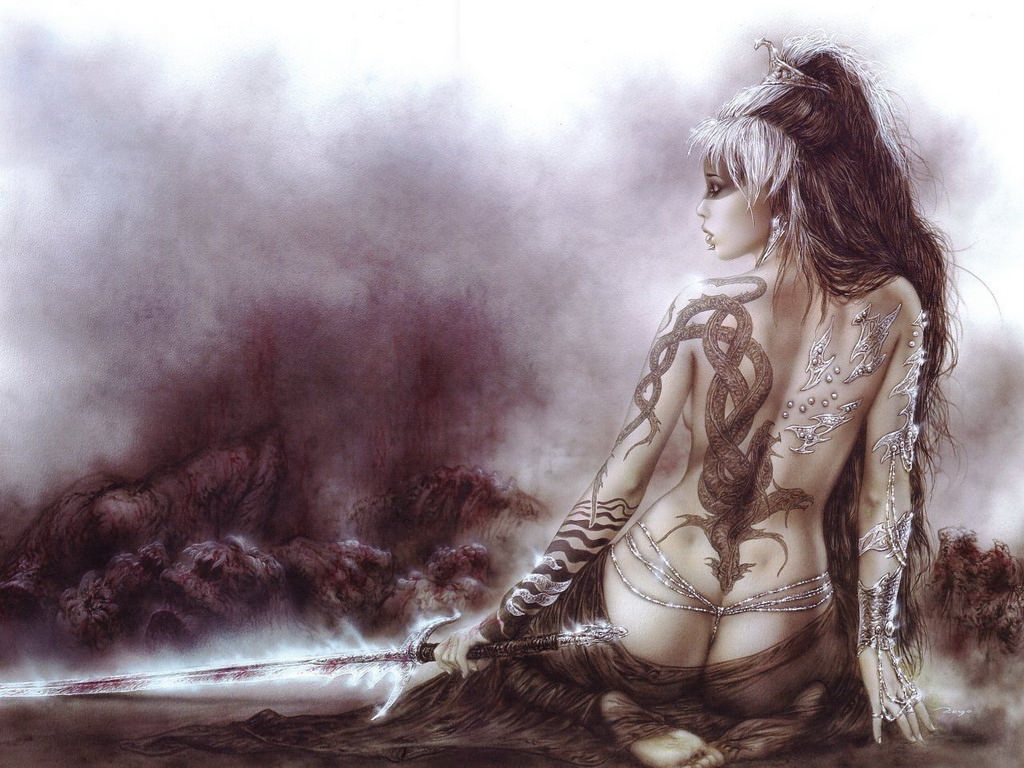 Среди трупов монстров, девушка с сияющим мечом, тату с драконом на спине, в тумане.