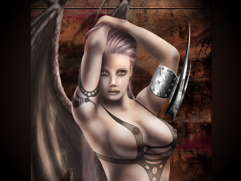 Крылатая воительница с лезвием на руке, девушка-воин с крыльями с обнаженной грудью.