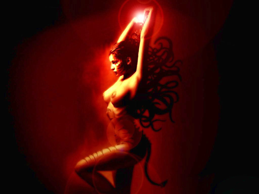 Сексуально опасна, девушка демон с огнем, хвост, обнаженная грудь, фэнтези девушка.
