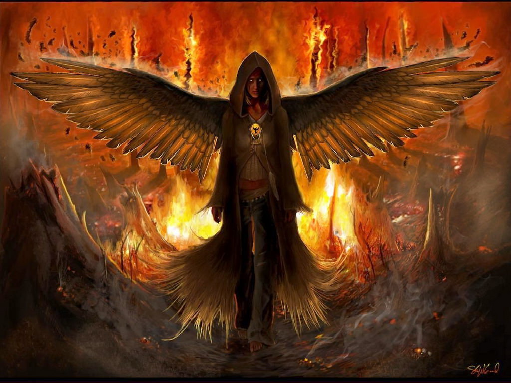 Ведьма, хаос, пламя. злая колдунья с крыльями, горят деревья, смерть и разрушения, ведьма в капюшоне.