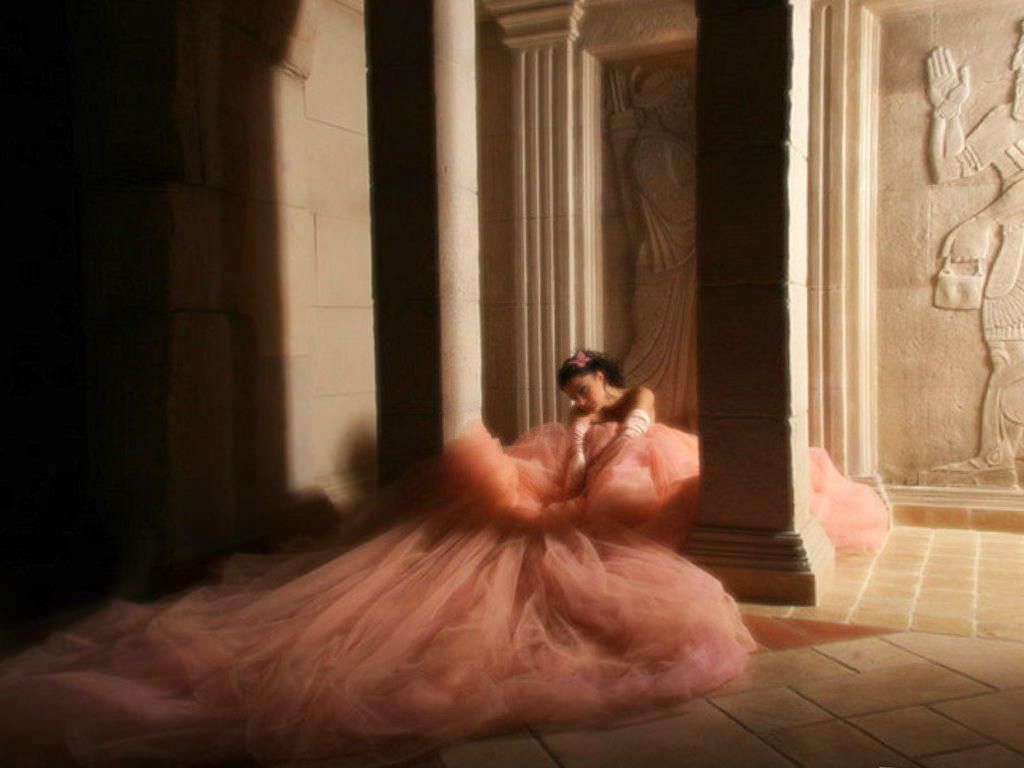Девушка, в, платье, египетские, мотивы, очень, длинное, розовое, платье, прекрасная, девушка, колонны, каменные, стены, присела
