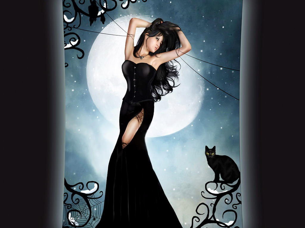 Черная кошка, прекрасная девушка в черном длинном платье и черная кошка, девушка на веревках, луна, звезды, ворон, паутина.