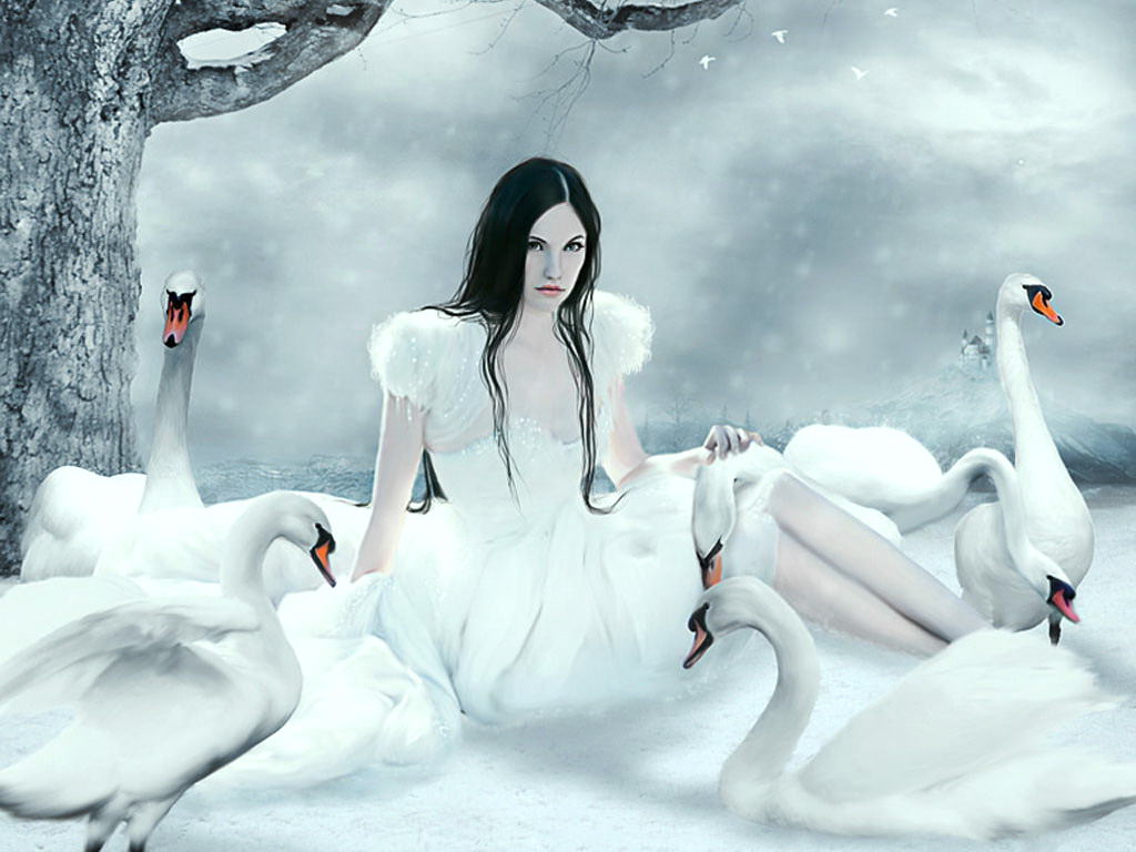 Девушка в белом платье, белые лебеди, снег, зима, дерево.