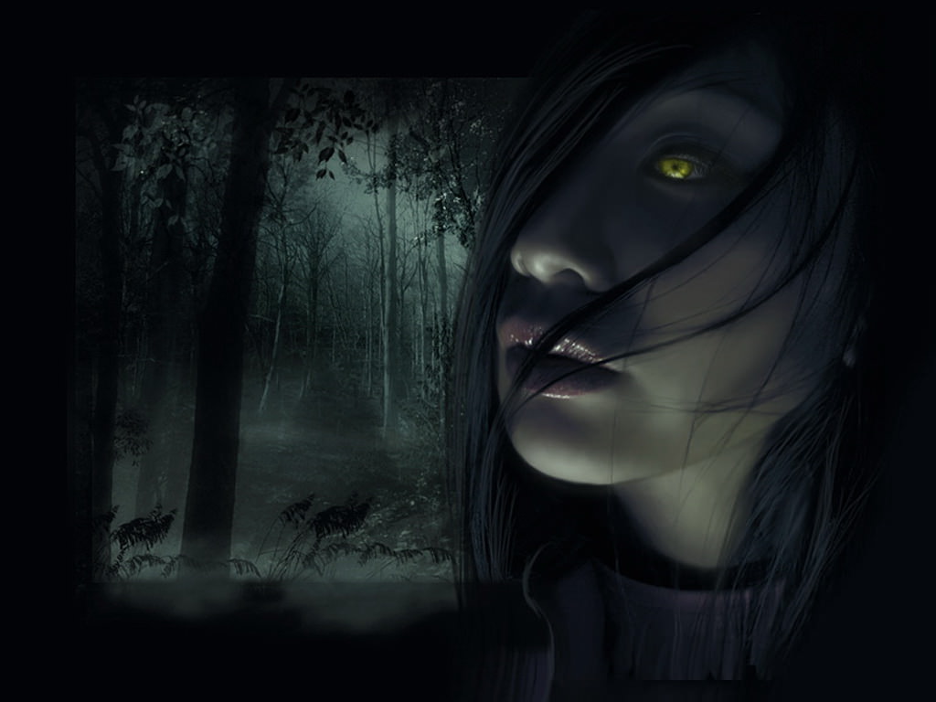 Охотница, оборотень, девушка со звериными глазами, лес, ночь, деревья.