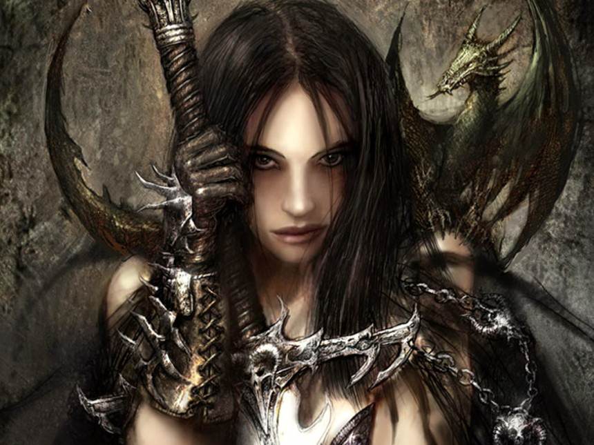 Прекрасная, воительница, с, мечом, и, с, драконом