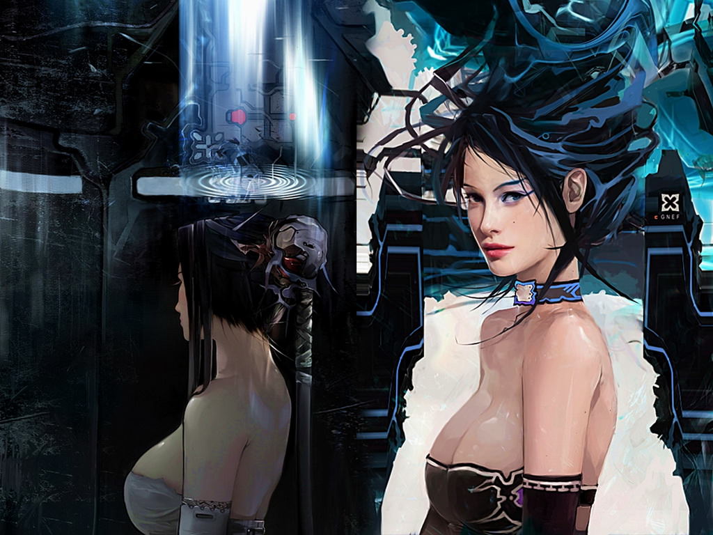Девушка с большой красивой грудью, ошейник, gnef, отражение, длинные волосы.