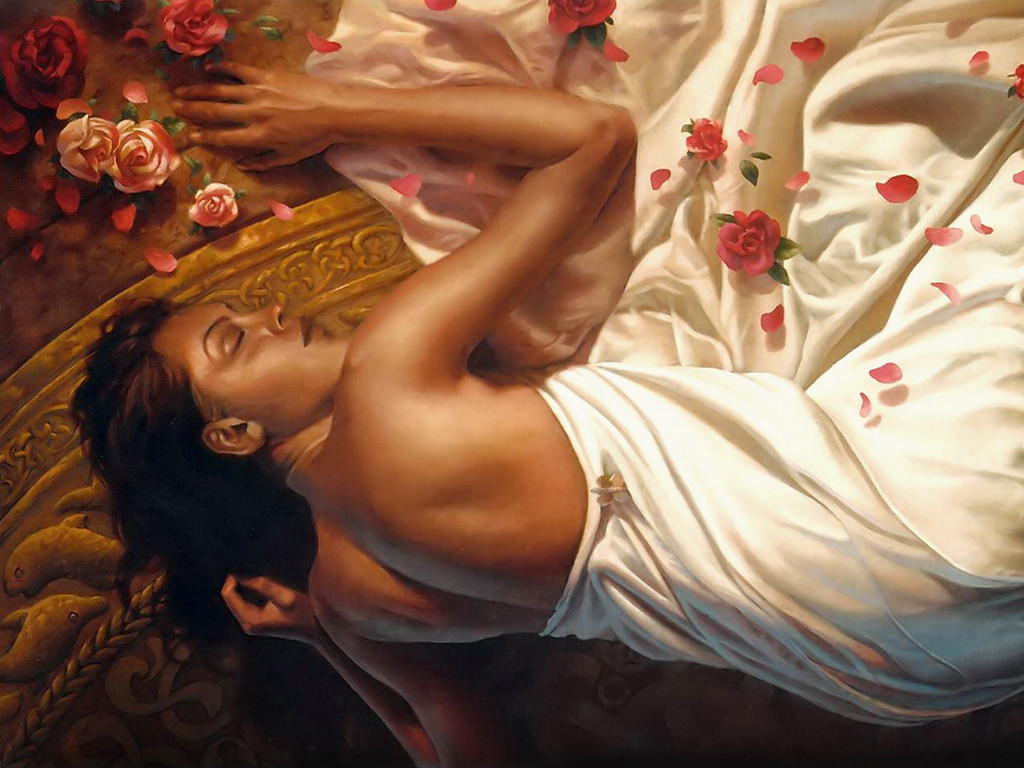 Спящая красотка, в простыне, розы, лепестки, цветы, сексуальная девушка спит, сон.