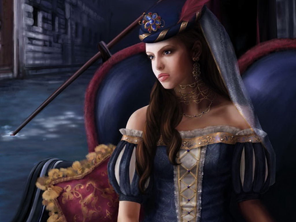 Девушка, в, платье, в, шляпке, в, лодке, Венеция, задумчивая, девушка, в, украшениях
