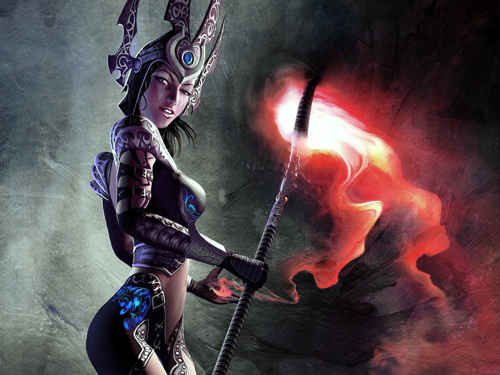 Девушка в волшебных доспехах, магический факел, пламя во тьме.