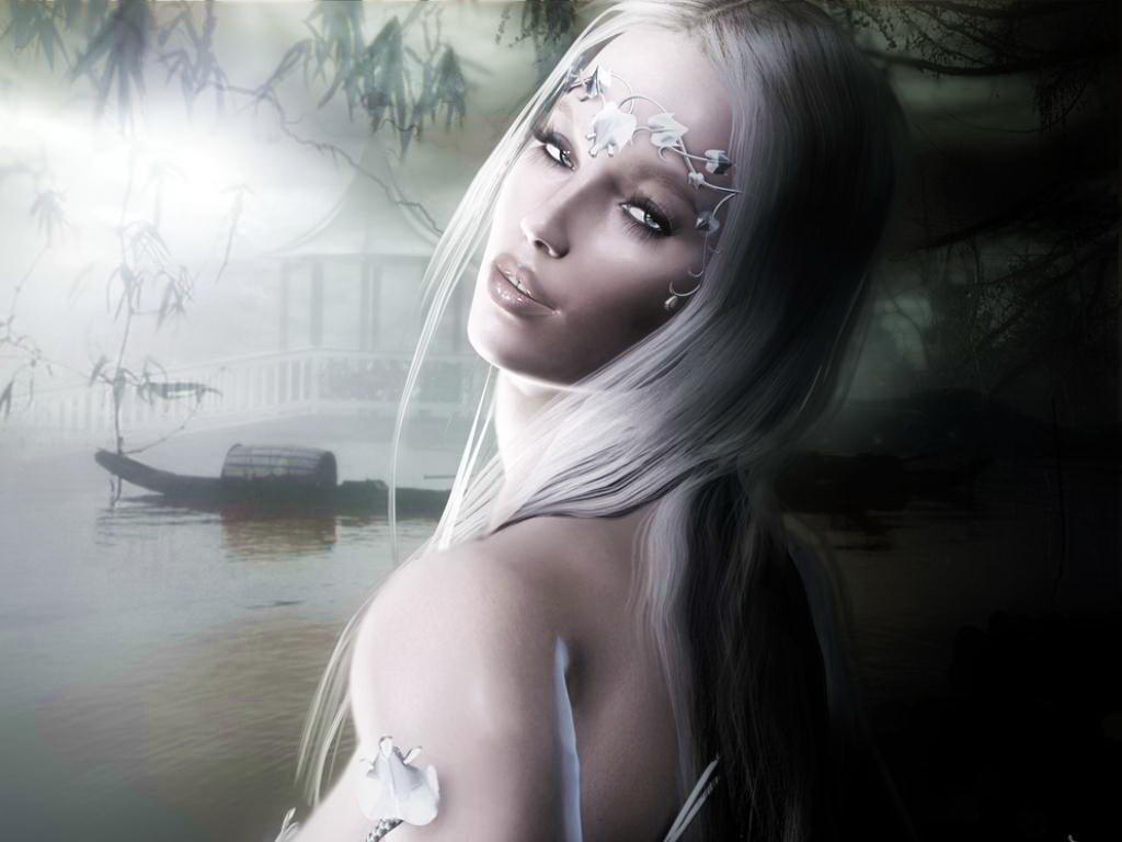 Привлекательная девушка, болото, манящий взгляд, сладкие губы, вода, лодка, мутная вода, украшение на лице.