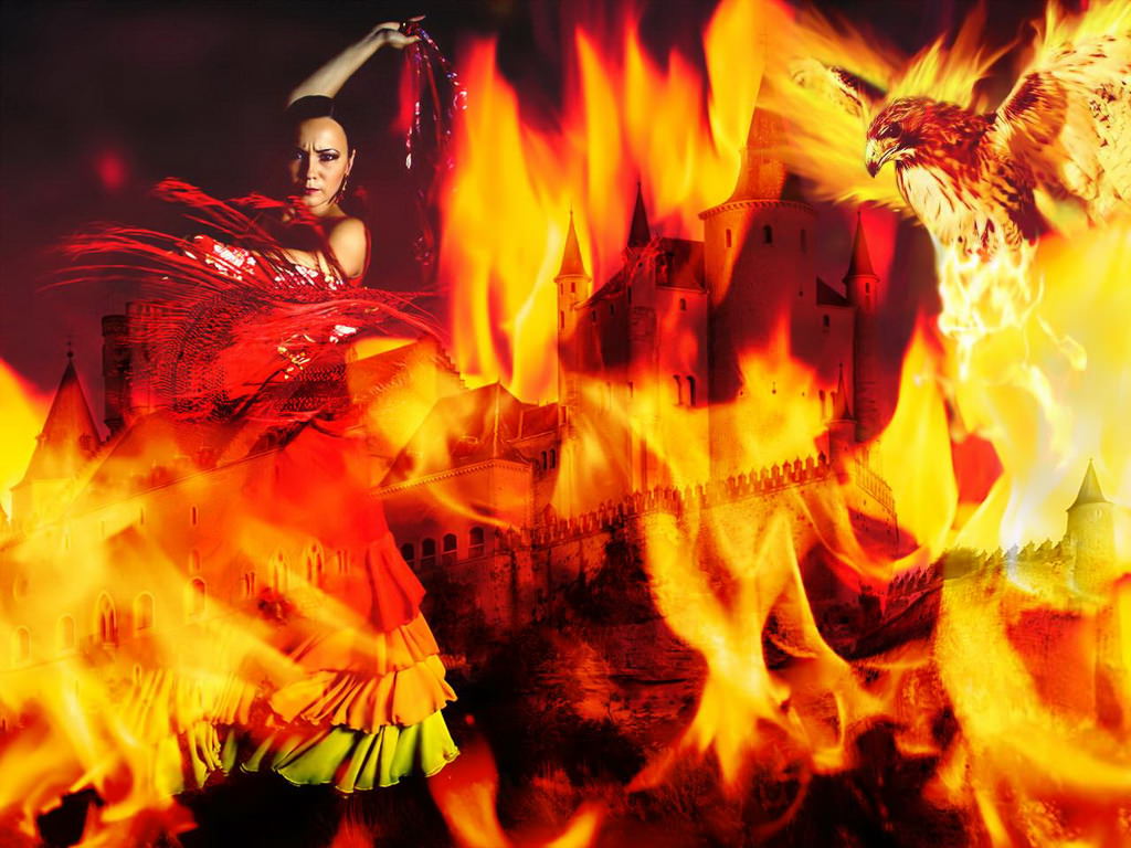 Танцующая азиатка, ястреб в пламени, горящий замок, огонь, пламя.
