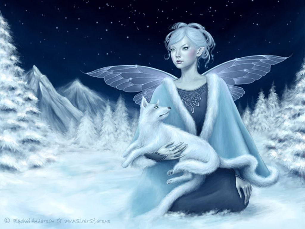 Снежная, фея, с, волчонком, в, зимнем, лесу, ночью, звезды, ночь, снег, с, крыльями, волк, елки, деревья, горы