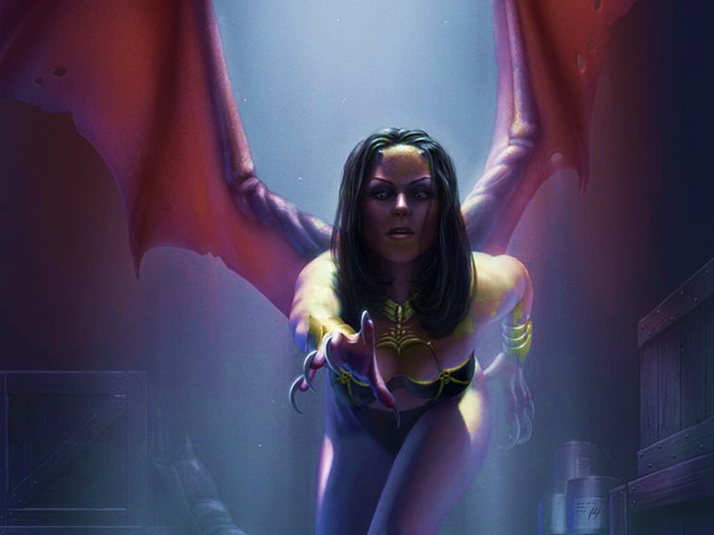 Притягательная девушка-демон, демонесса, с крыльями, устрашающий взгляд.
