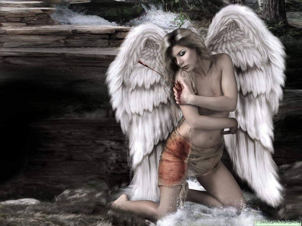 Раненный ангел, девушку-ангела ранили в руку стрелой из лука, кровь, с крыльями, вода.