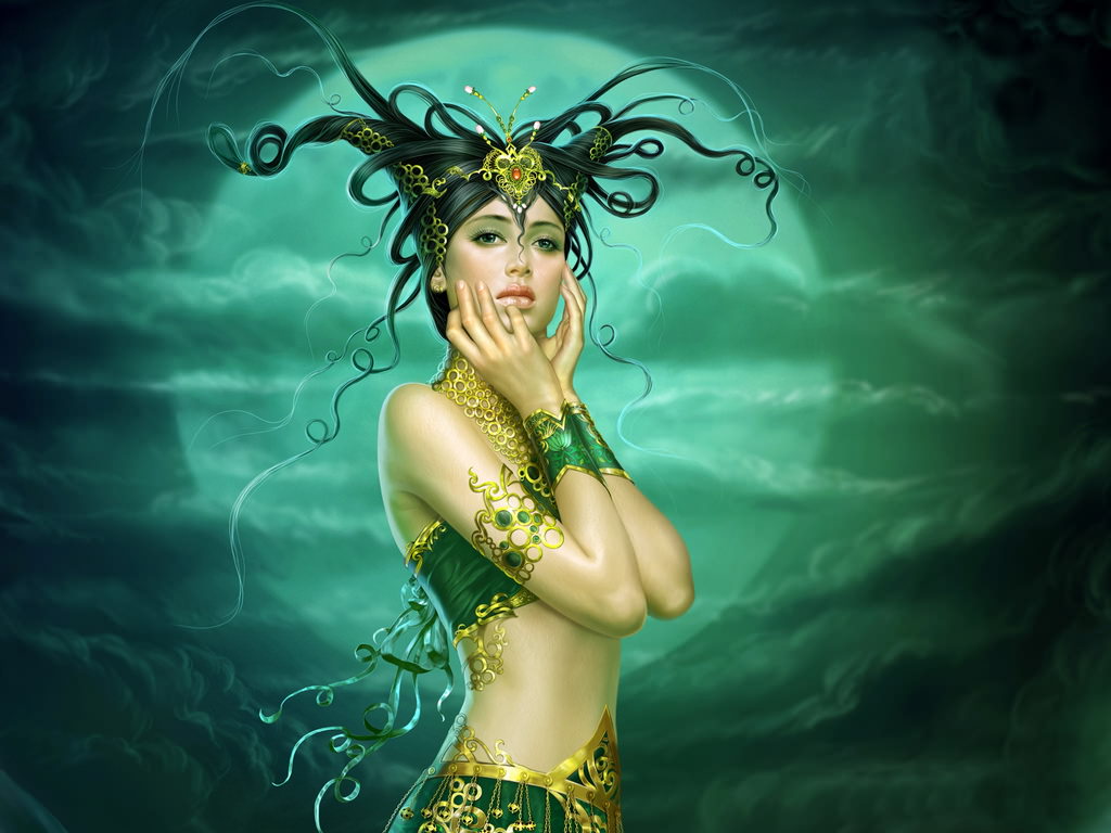 Девушка, луна, туман, тучи, танцовщица, яркая, девушка, под, луной, схватилась, за, лицо
