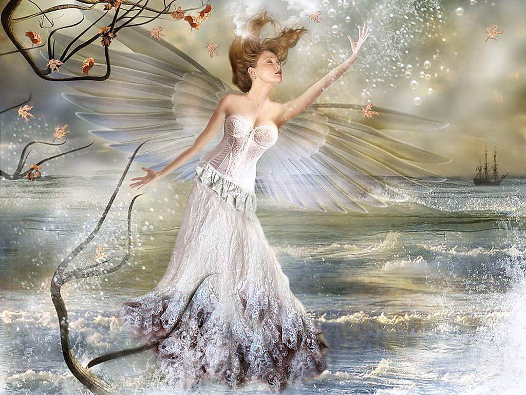 Крылатая, красотка, прекрасная, девушка, в, белом, платье, с, крыльями, в, море, в, воде, брызги, корабль, ветки