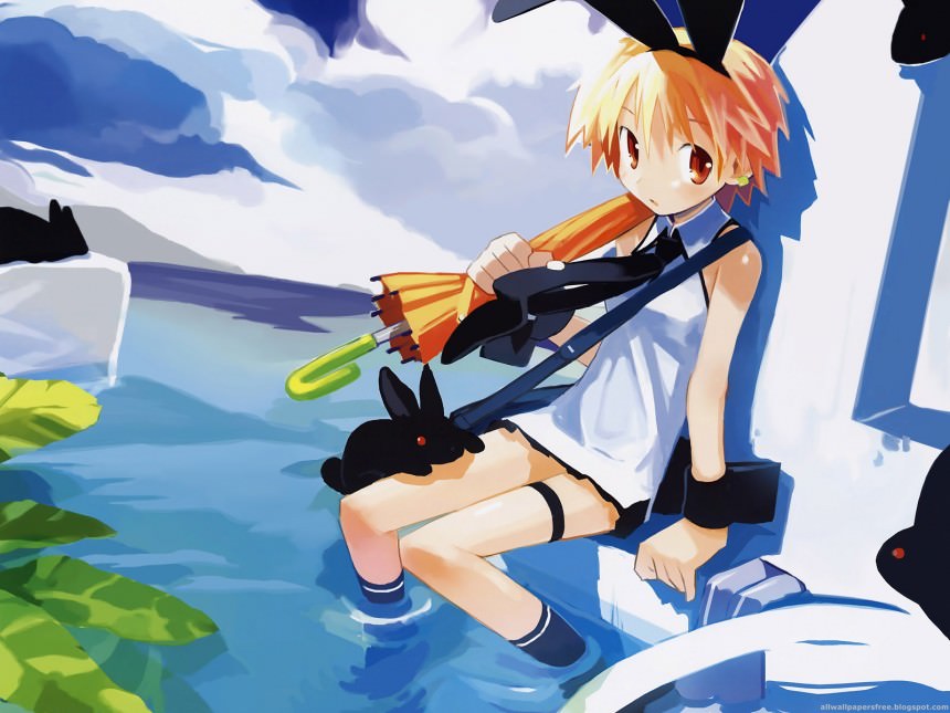 Аниме, девушка, с, зонтом, и, кроликами, на, воде