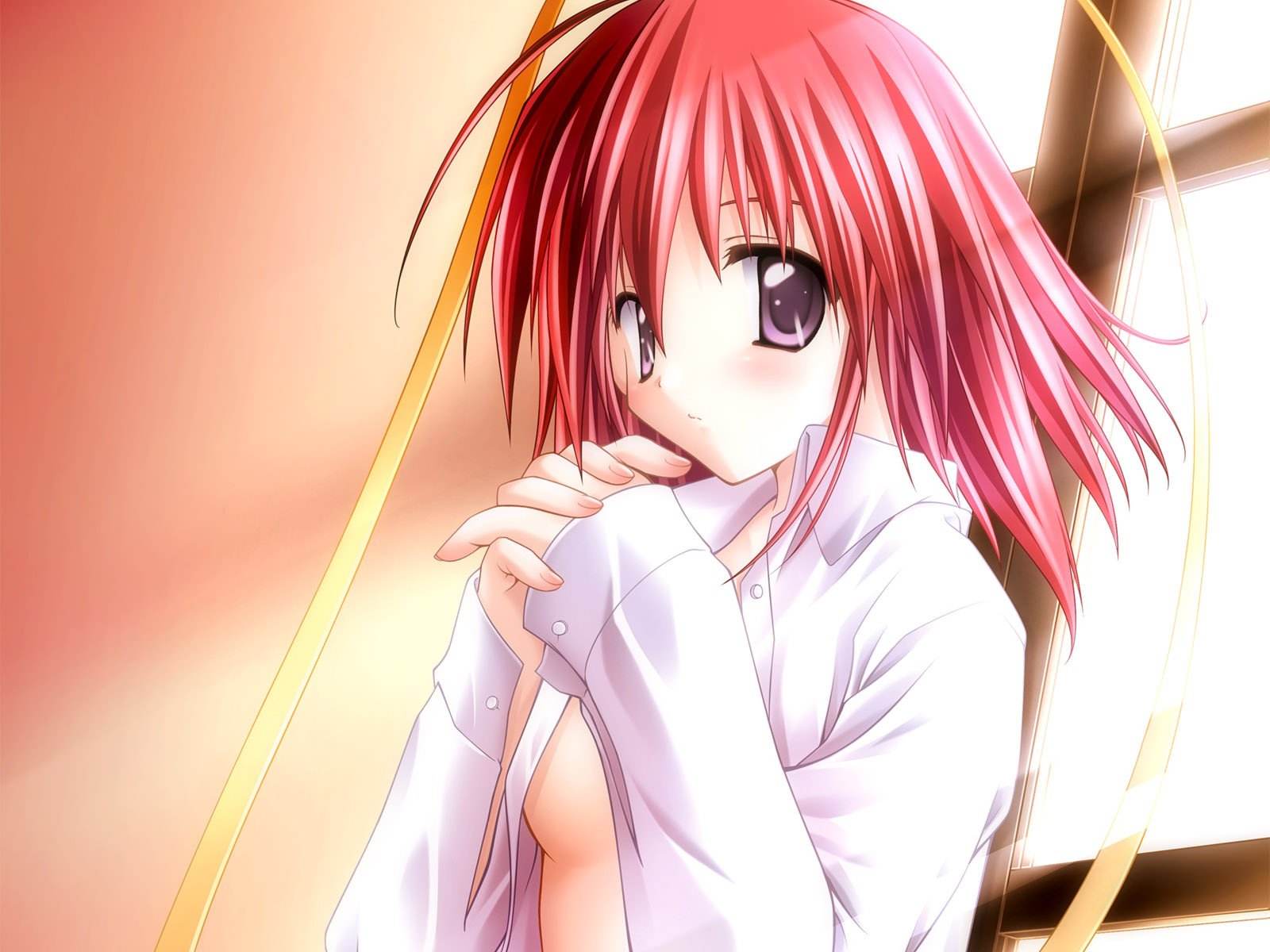 Настороженная аниме девушка у окна, аниме девушка с красными волосами.