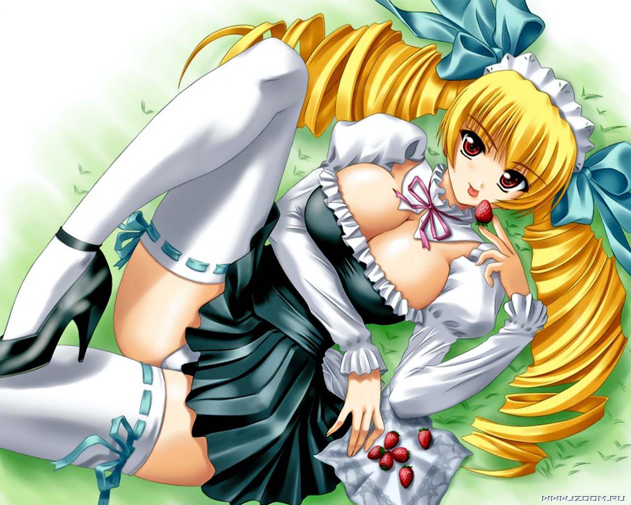 Аниме, девушка, с, клубникой, в, белых, чулках, трусики, под, юбкой