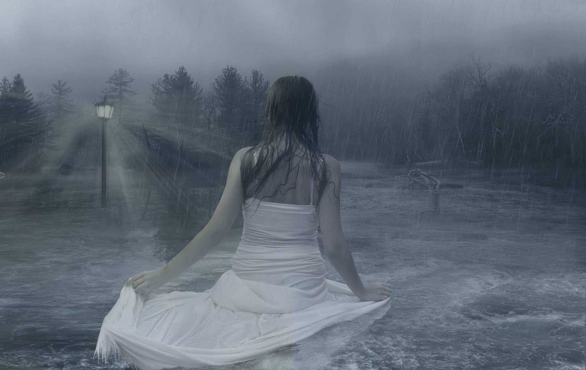 Ливень, фонарь, девушка, в, белом, платье, вода, потоп, свет, мокрая, темные, обалка, тучи, деревья