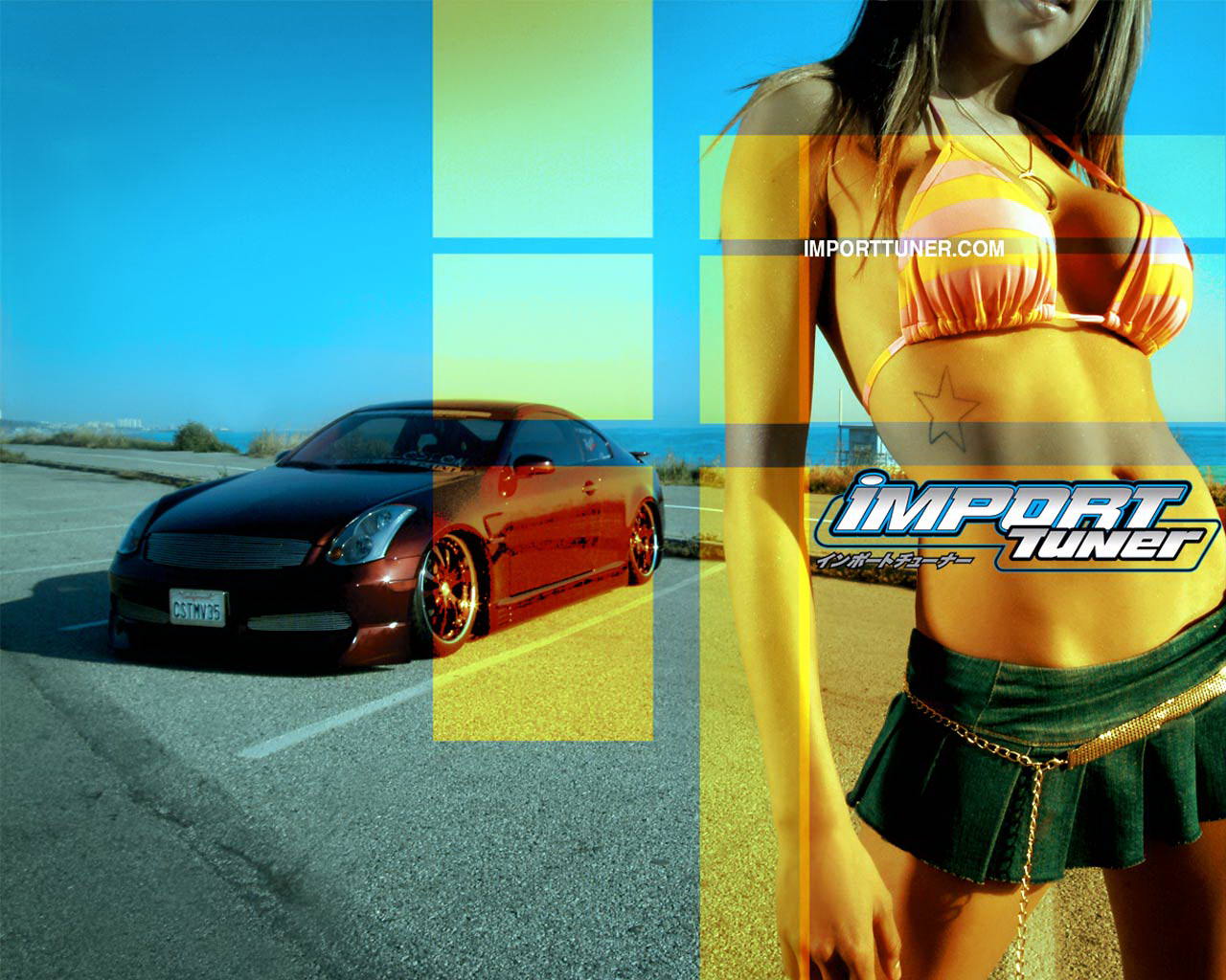 Сексуальная девушка в красивыми сиськами в бикини, мини юбка с цепочкой, за ней стоит коричневый спорткар, Girls&Cars (298).