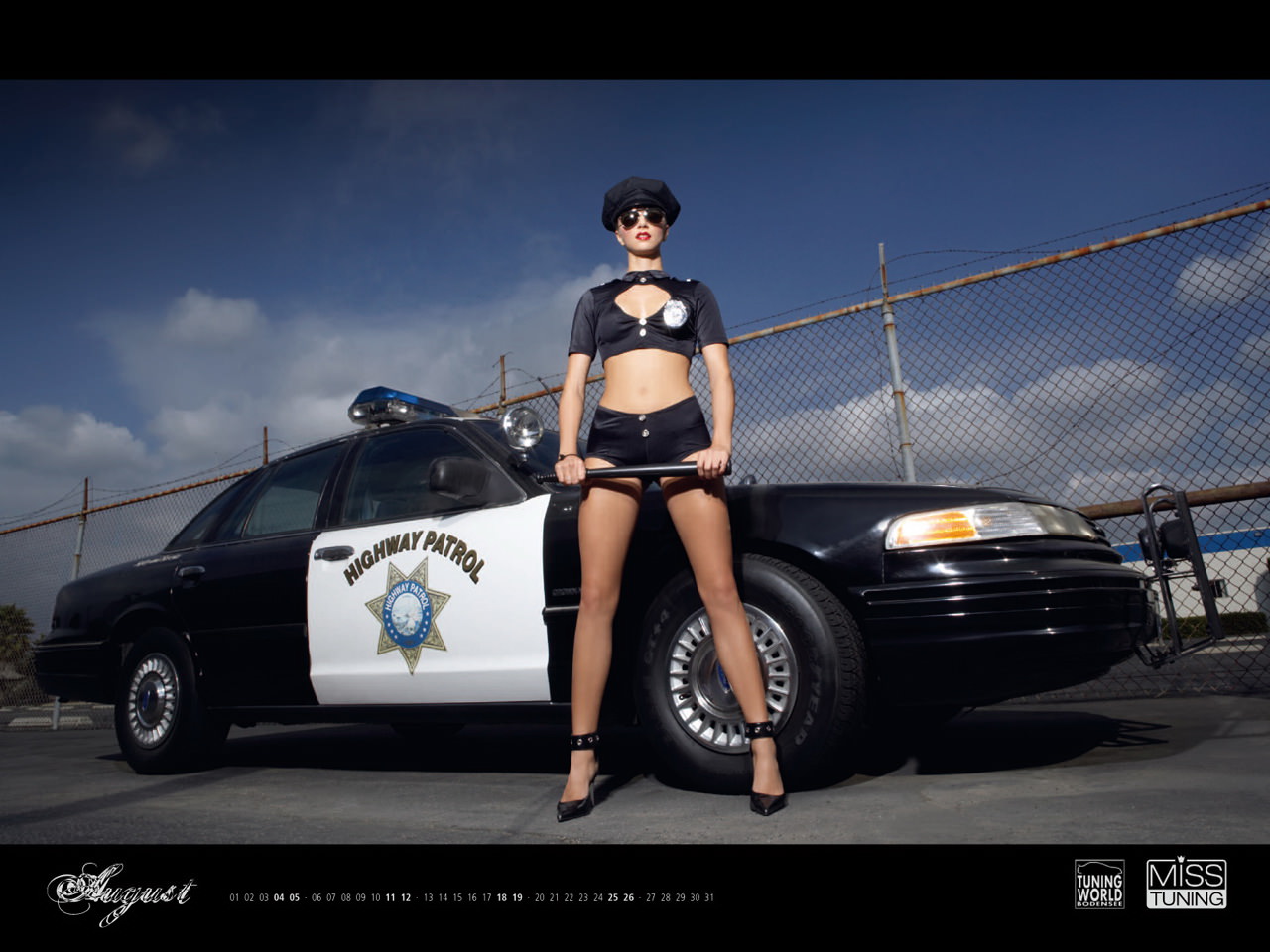 Девушка в эротическом костюме полицейского, фуражка, дубинка, шортики, туфли, полицейская машина.