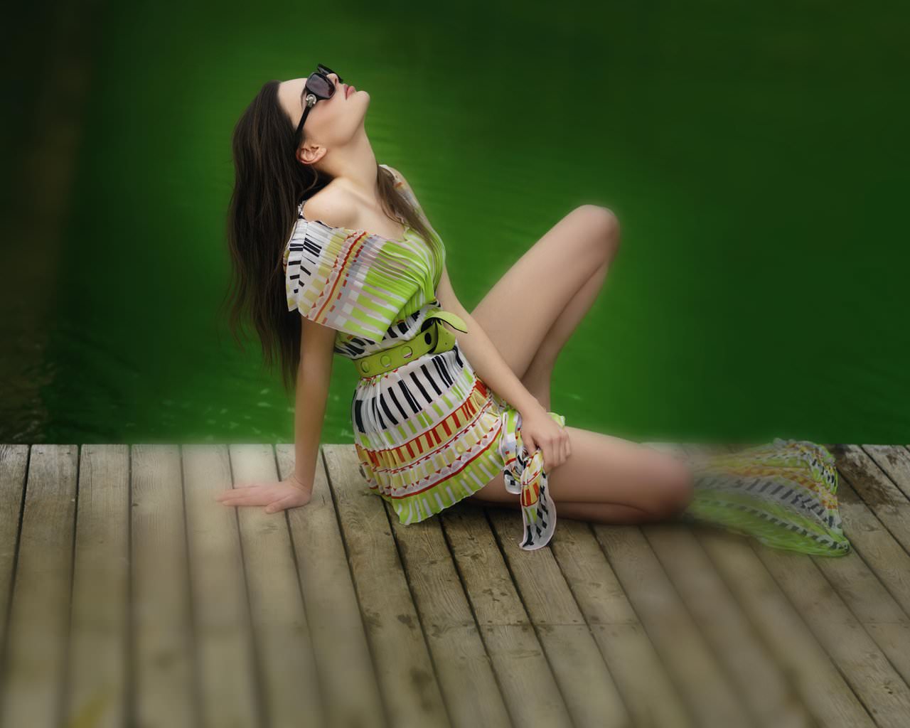 Девушка, в, ярком, платье, сидит, на, мостике, у, зеленой, воды