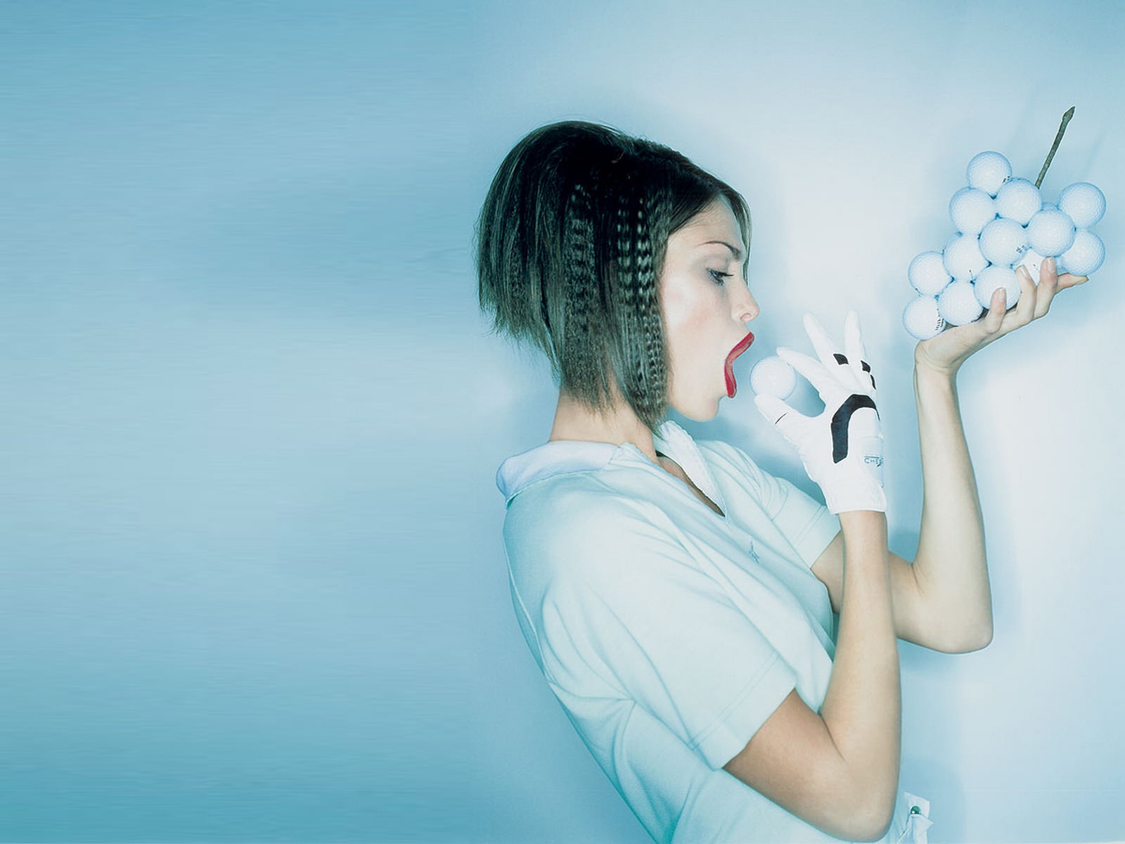 Девушка дует на шарики, красные губы. Девушки на рабочий стол, картинки, обои, фото.