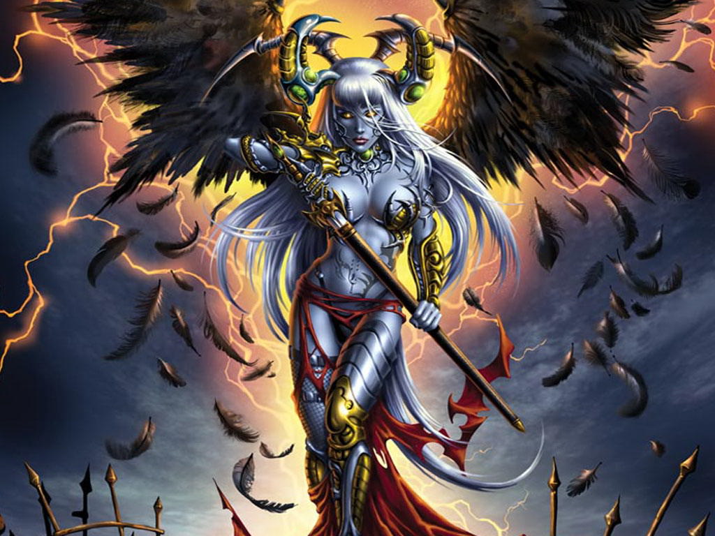 Повелительница демонов с мечом, с крыльями, прекрасная демонесса, перья, рога.