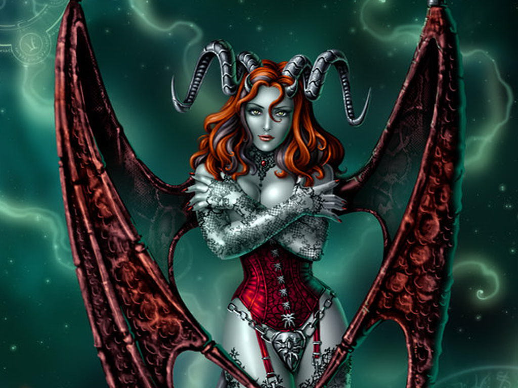 Рыжеволосая девушка-демон, демонесса с крыльями.