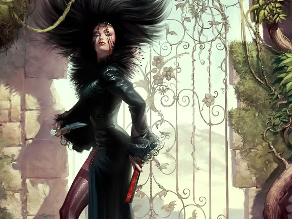 Ведьма с ножом, ведьма в чулках в черном платье с необычной прической.