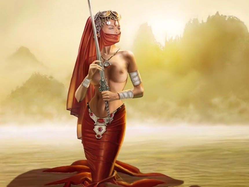 Фэнтези, девушка, в, тумане, с, обнаженной, грудью, с, мечом