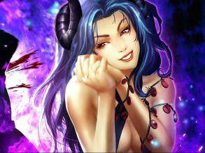 Хозяйка ада, адская демонесса с трезубцем, сексуальная девушка-демон с хвостом, черепа, огонь, ад.