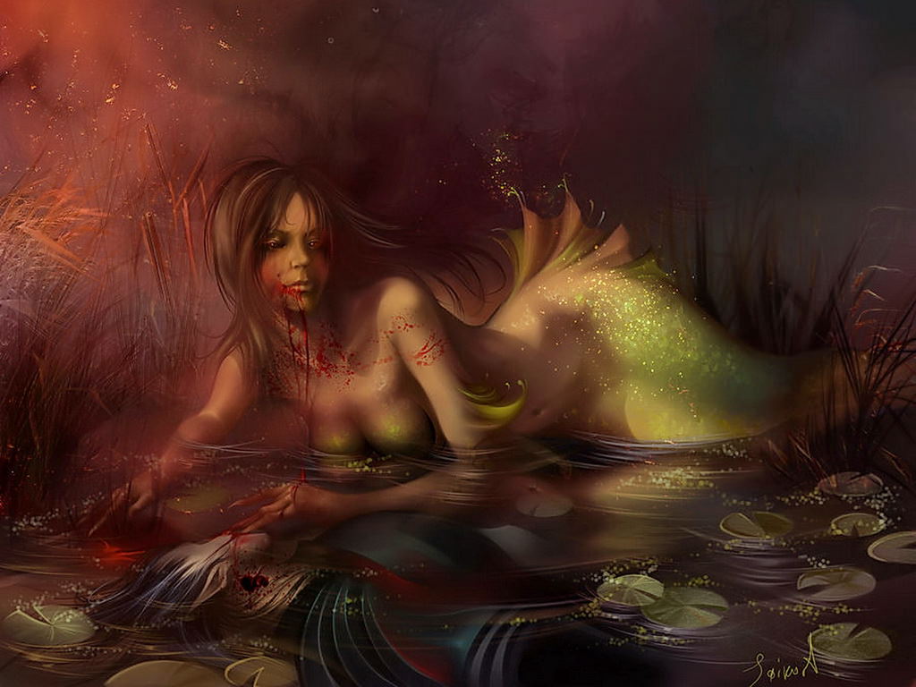 Водяной монстр, девушка-рыба есть человека в воде, кровь на губах.