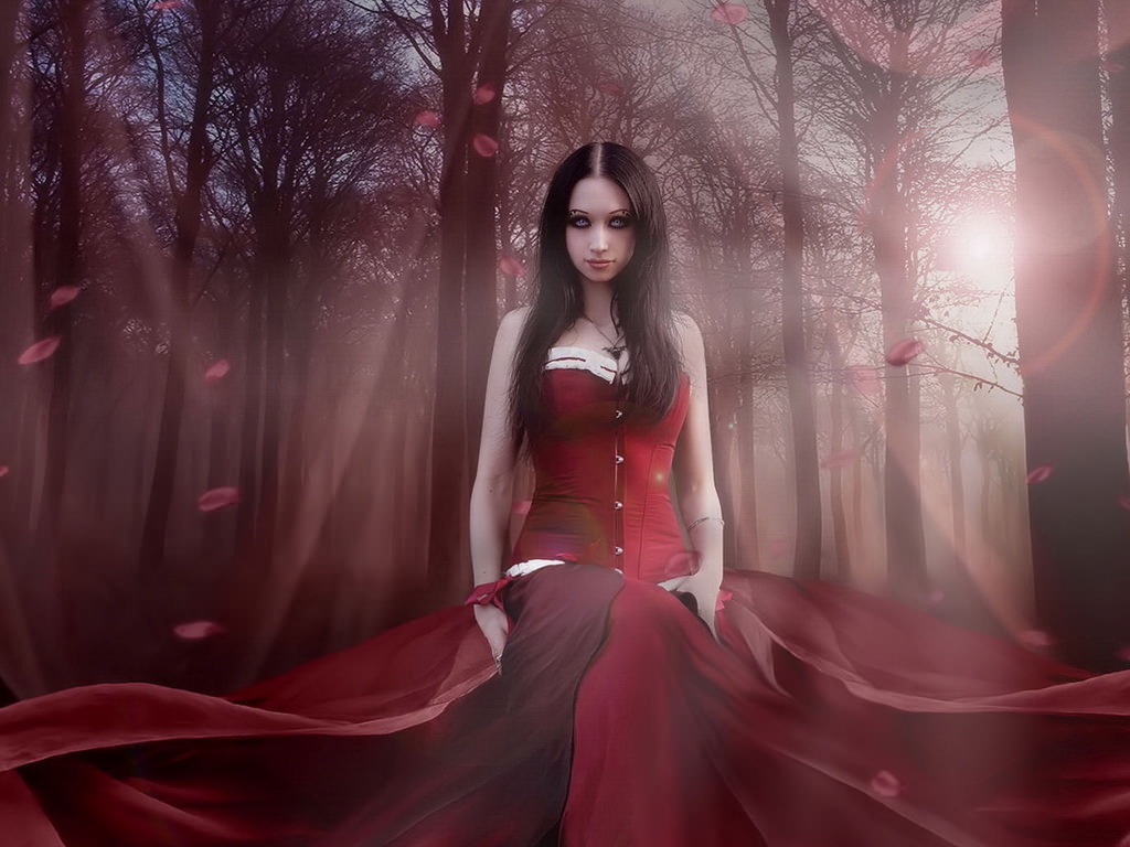Азиатская колдунья в лесу, красное платье, черные глаза, лес, деревья.