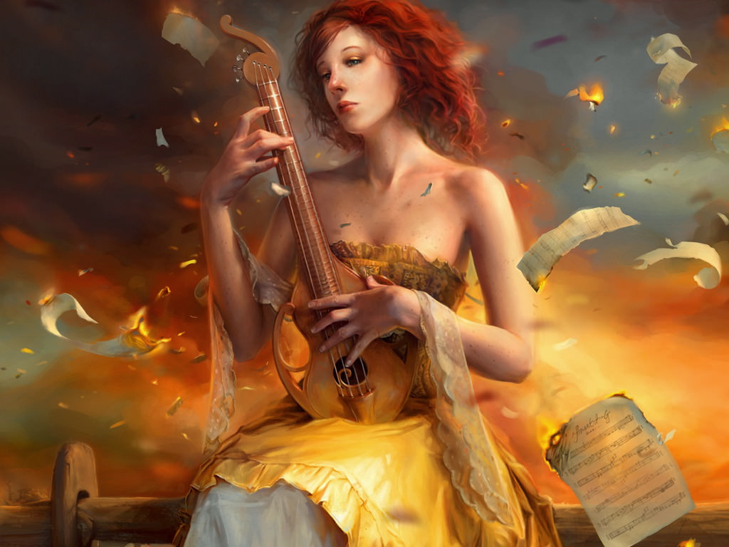 Печальная музыкантка, фэнтези девушка играет на музыкальном инструменте с печалью, горящие ноты.