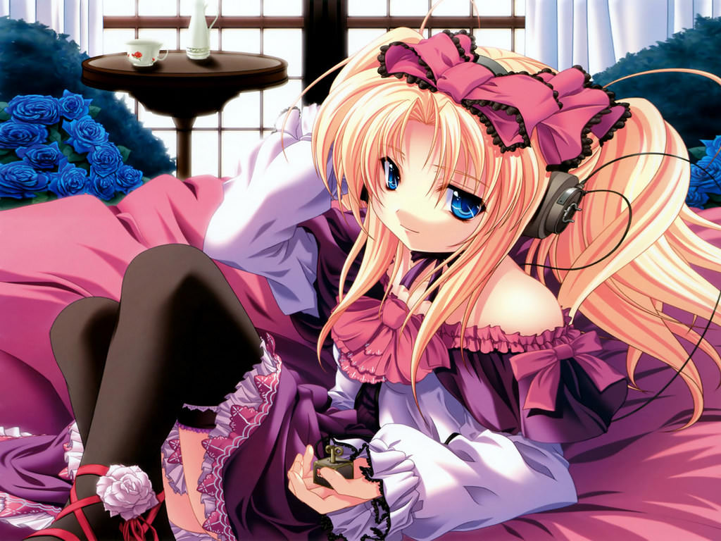 В наушниках на кровати, аниме девушка в юбке в чулках на розовом одеяле, слушает музыку.