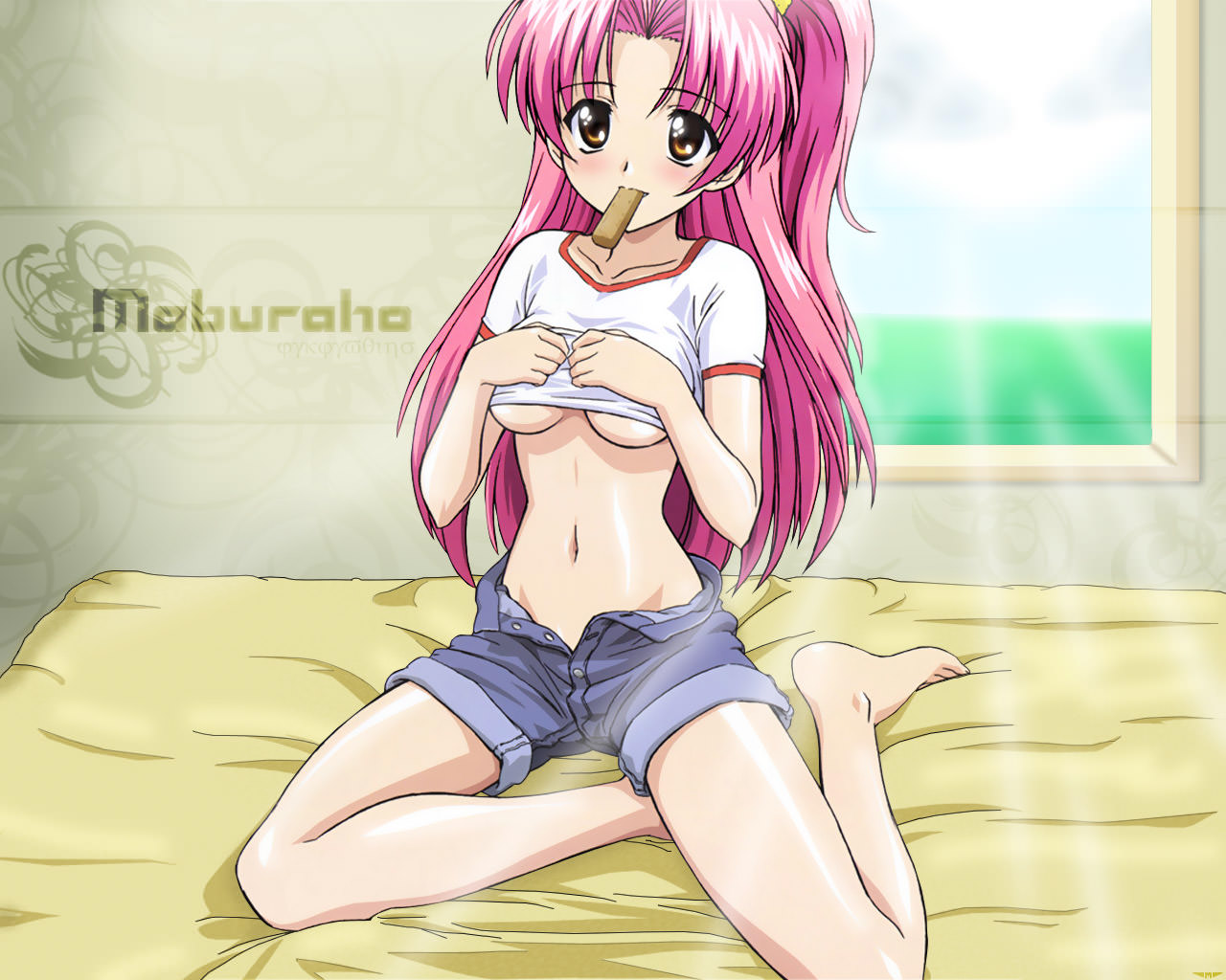 Шоколад во рту, девушка есть шоколадку, сексуальная девушка на кровати, розовые волосы.