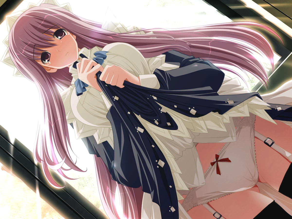 Задрала юбку, пустила слезы, чулки на подтяжках, показала трусики, длинные розовые волосы, девушка у окна.