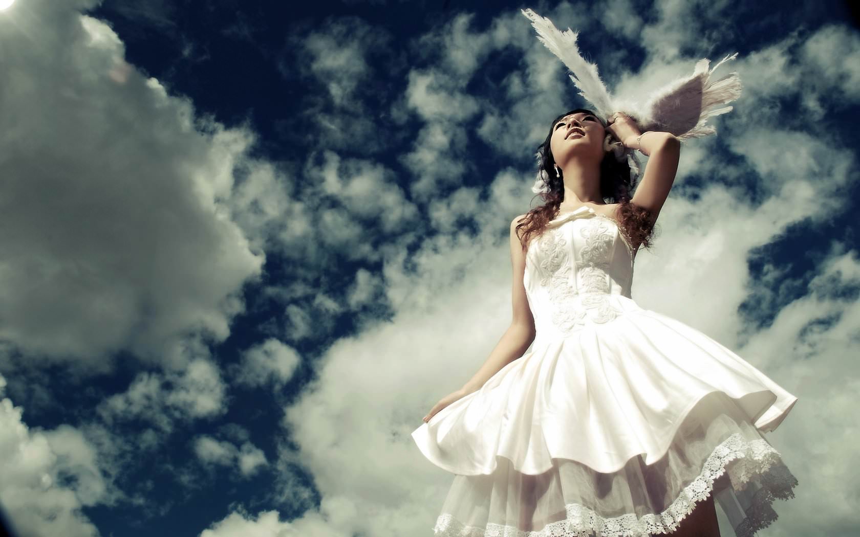 Азиатка с перьями под облаками в белом платье, летающая в облаках, крылышки на голове.
