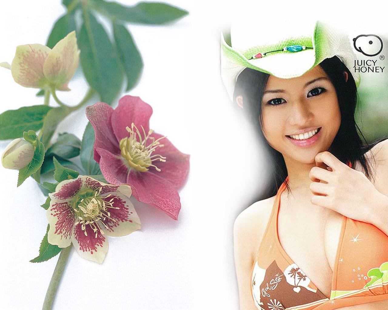 Азиатка-ковбойша, радостная, японка, в, бикини, в, ковбойской, шляпе, цветы, juicy, honey