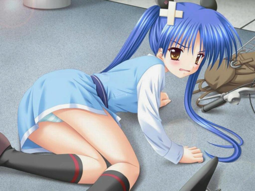 Упала и негодует, девушка в голубом платье упала на пол, видно трусики под юбкой, синие волосы, сумка.