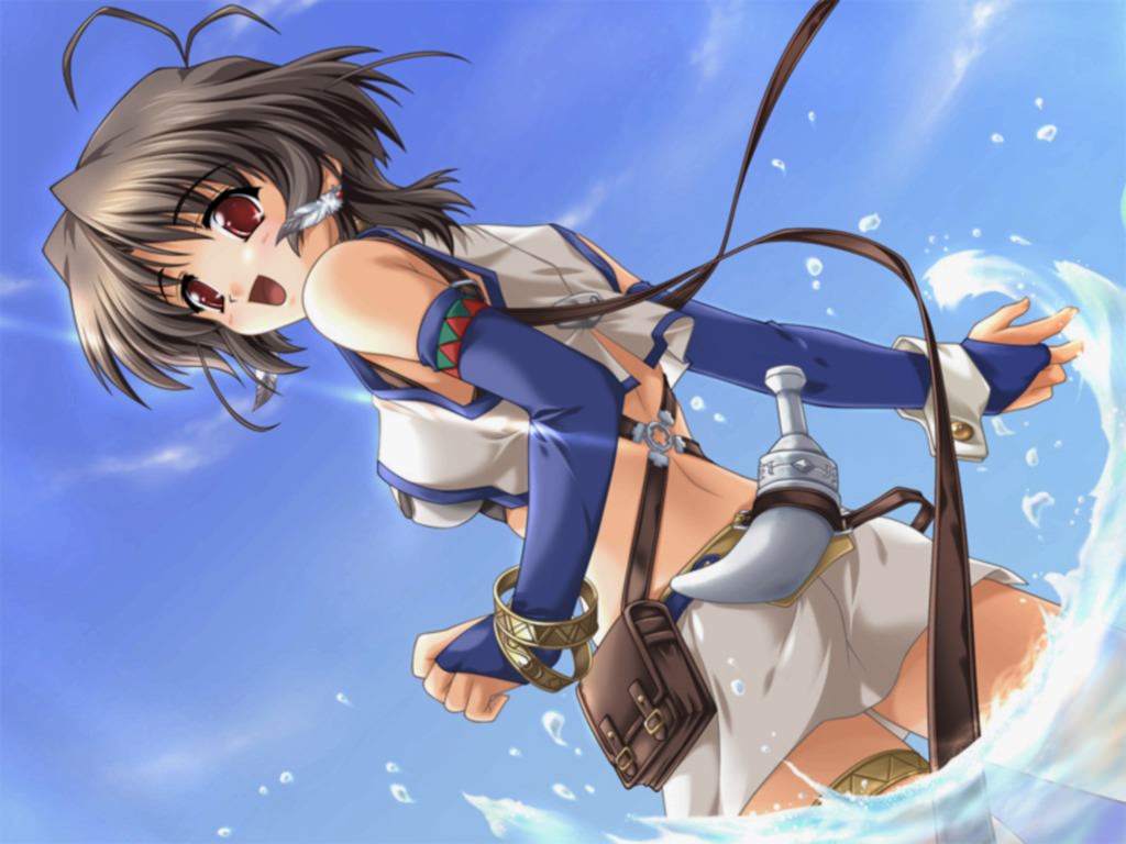 Браслеты, сумочка и нож, девушка в воде, голубое небо, радость.