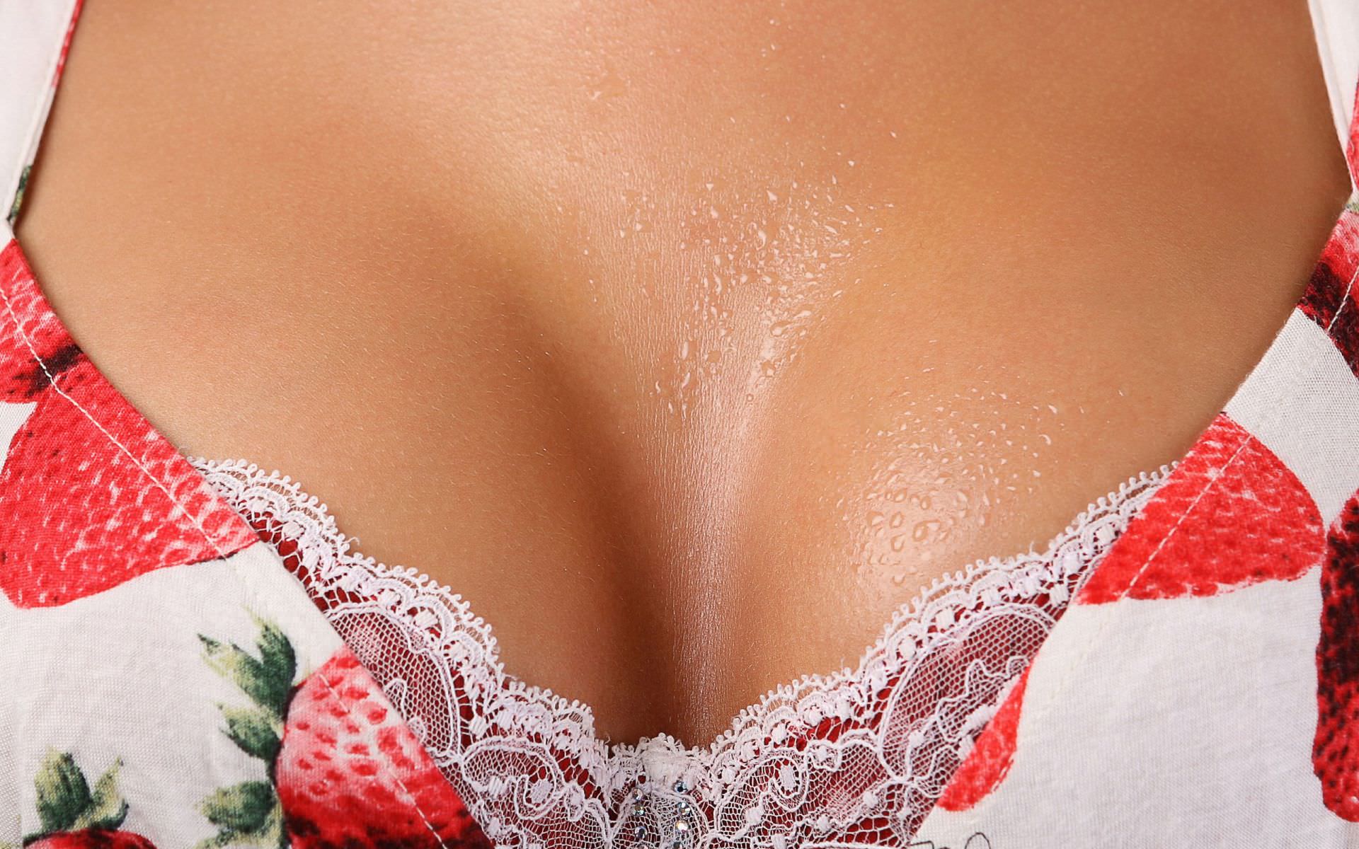 Аппетитная влажная грудь, декольте, манящие сиськи, платье в клубничку.