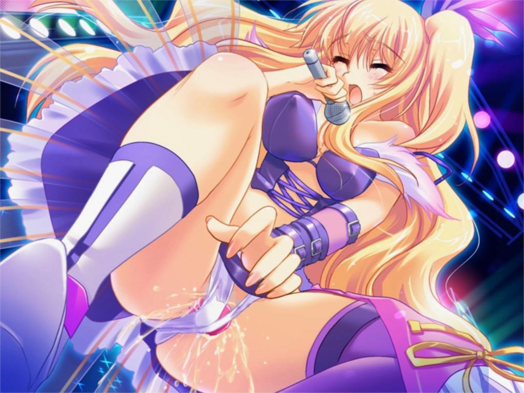 Певица извращенка, развратная певица с вибратором в щелке во время своего концерта, микрофон у рта, щелка течет, опускает руку на юбку, чтобы скрыть все это, кончающая блондинка на сцене.