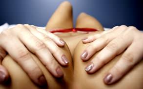 Девочка с пирсингом в животике и в белых стрингах, в теплой кофточке, стоит около стола и читает книгу.